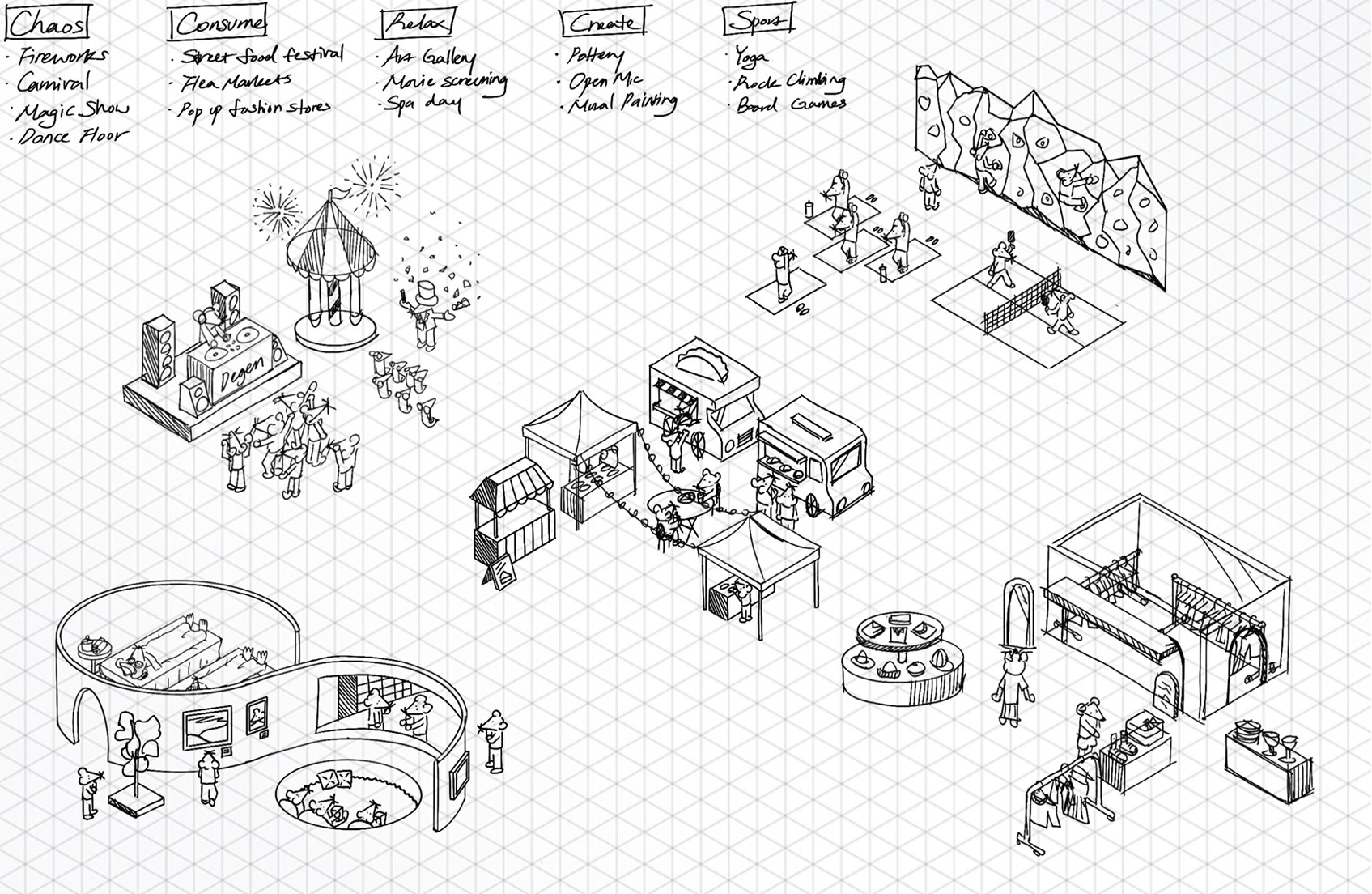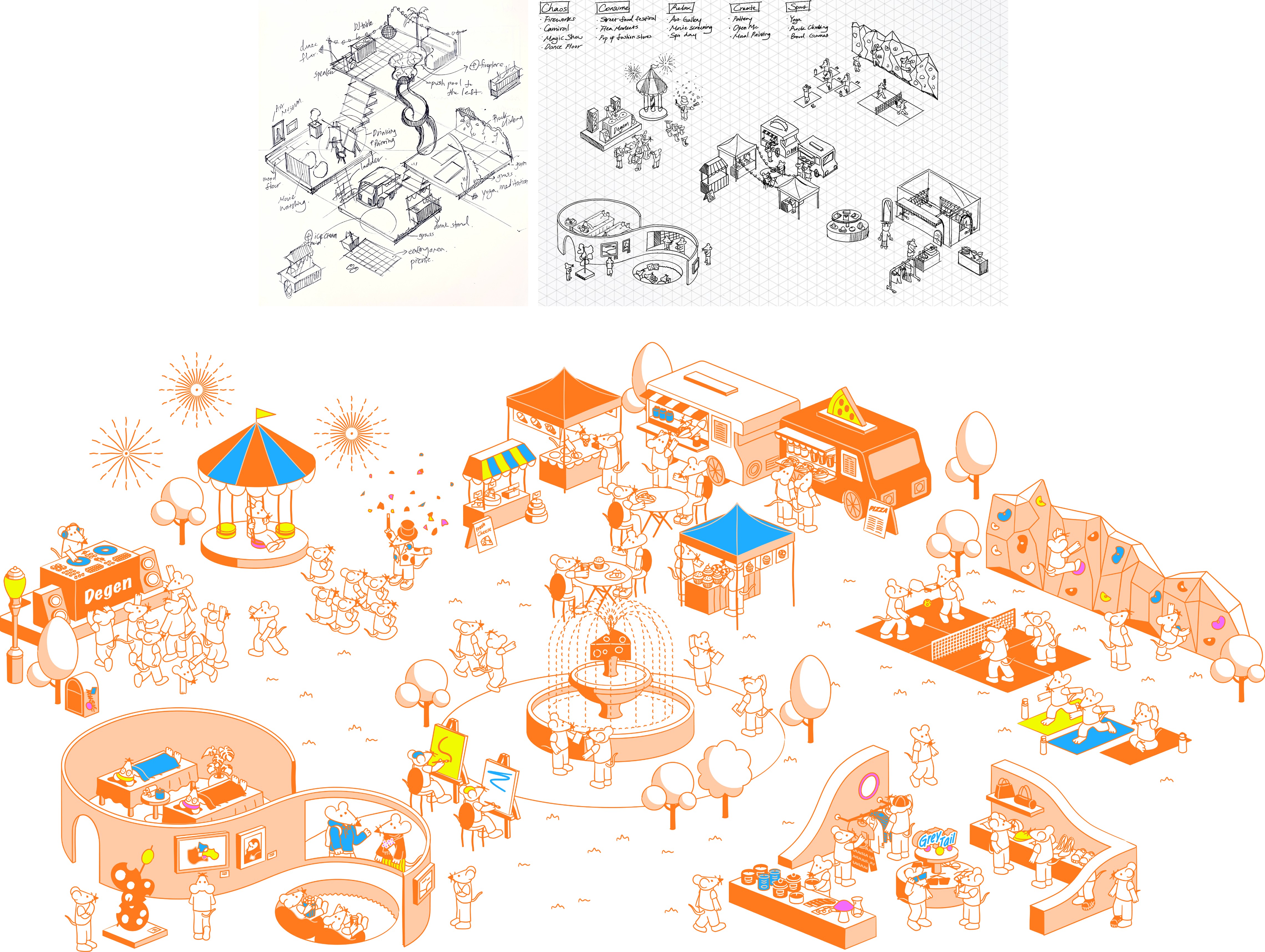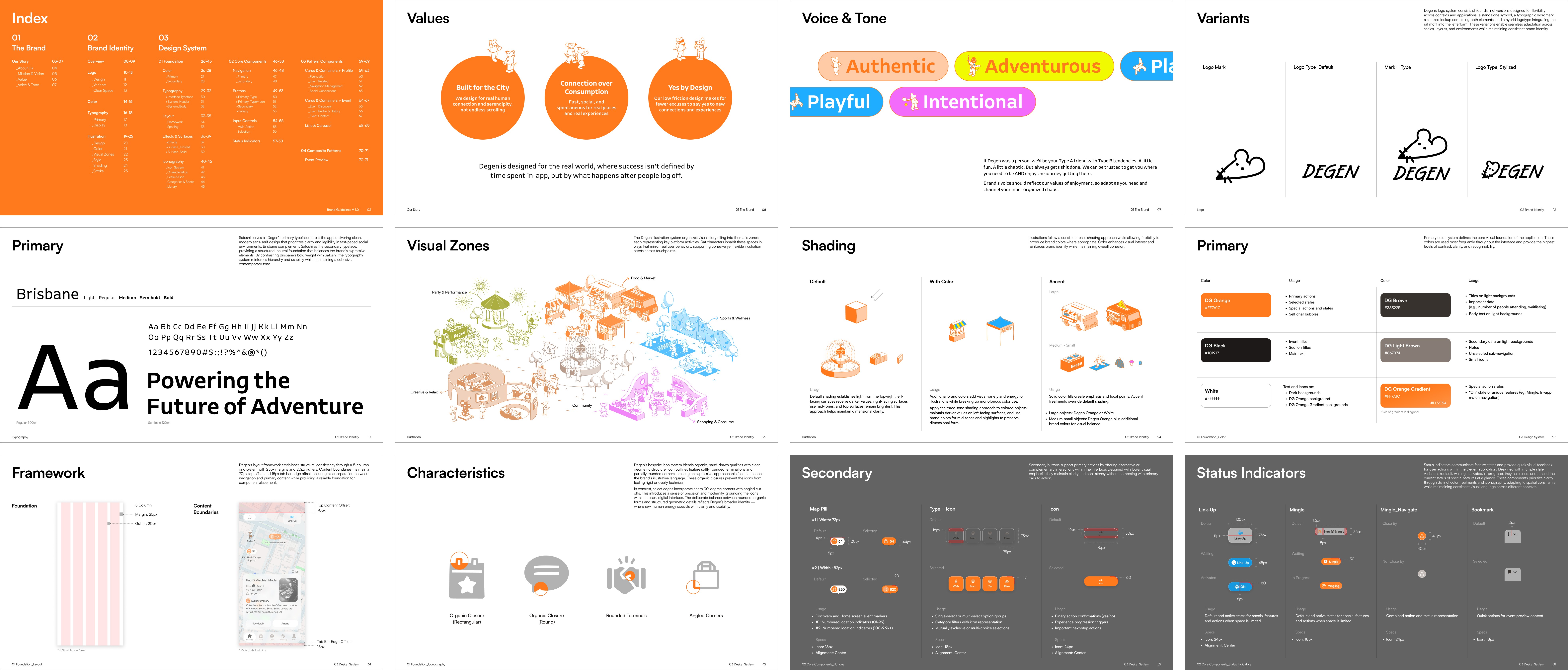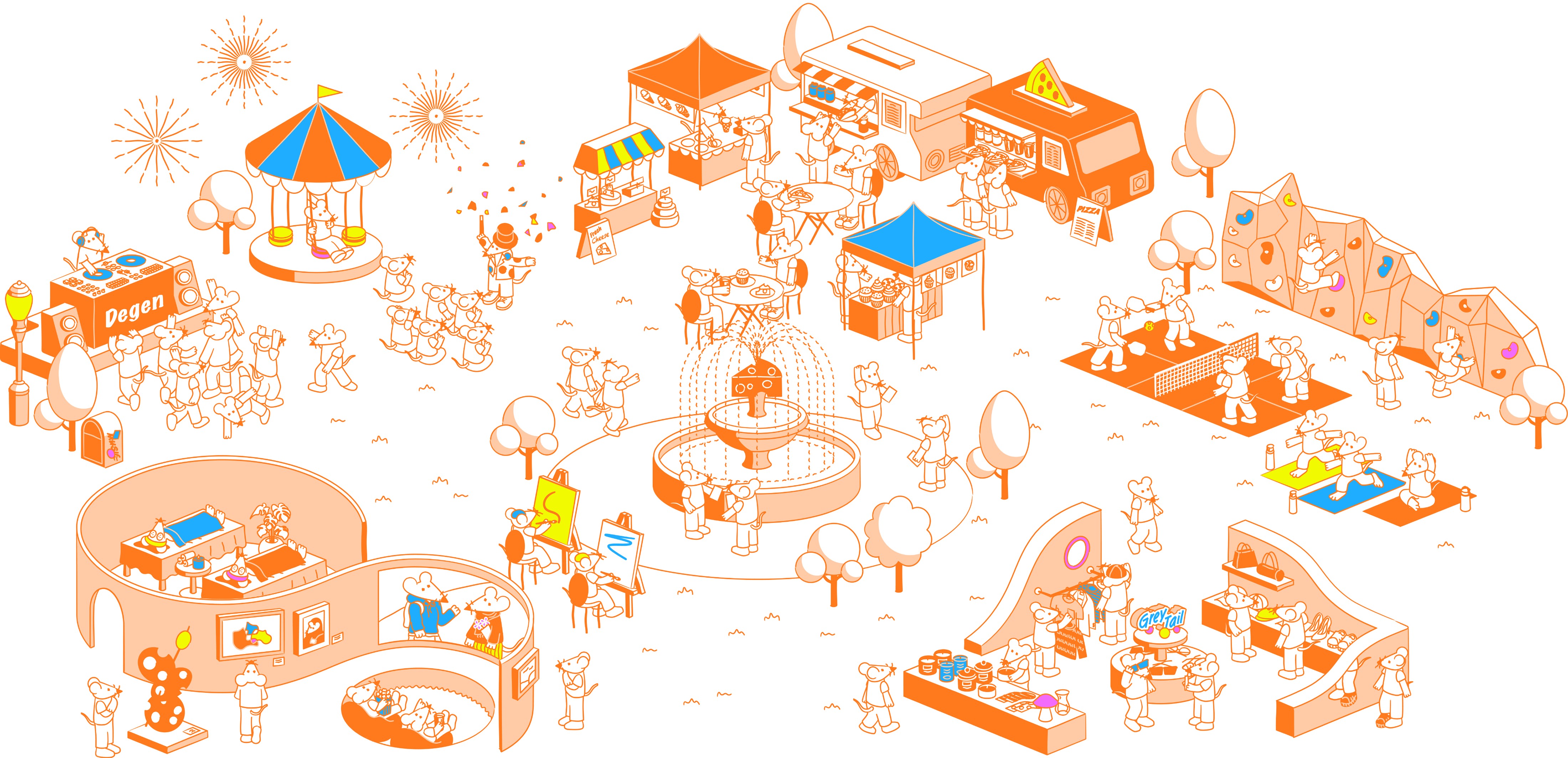 Degen's Illustrative system visualizes the brand as a navigable social ecosystem. Five interconnected zones represent different modes of urban life, with rat characters acting as stand-ins for real users.