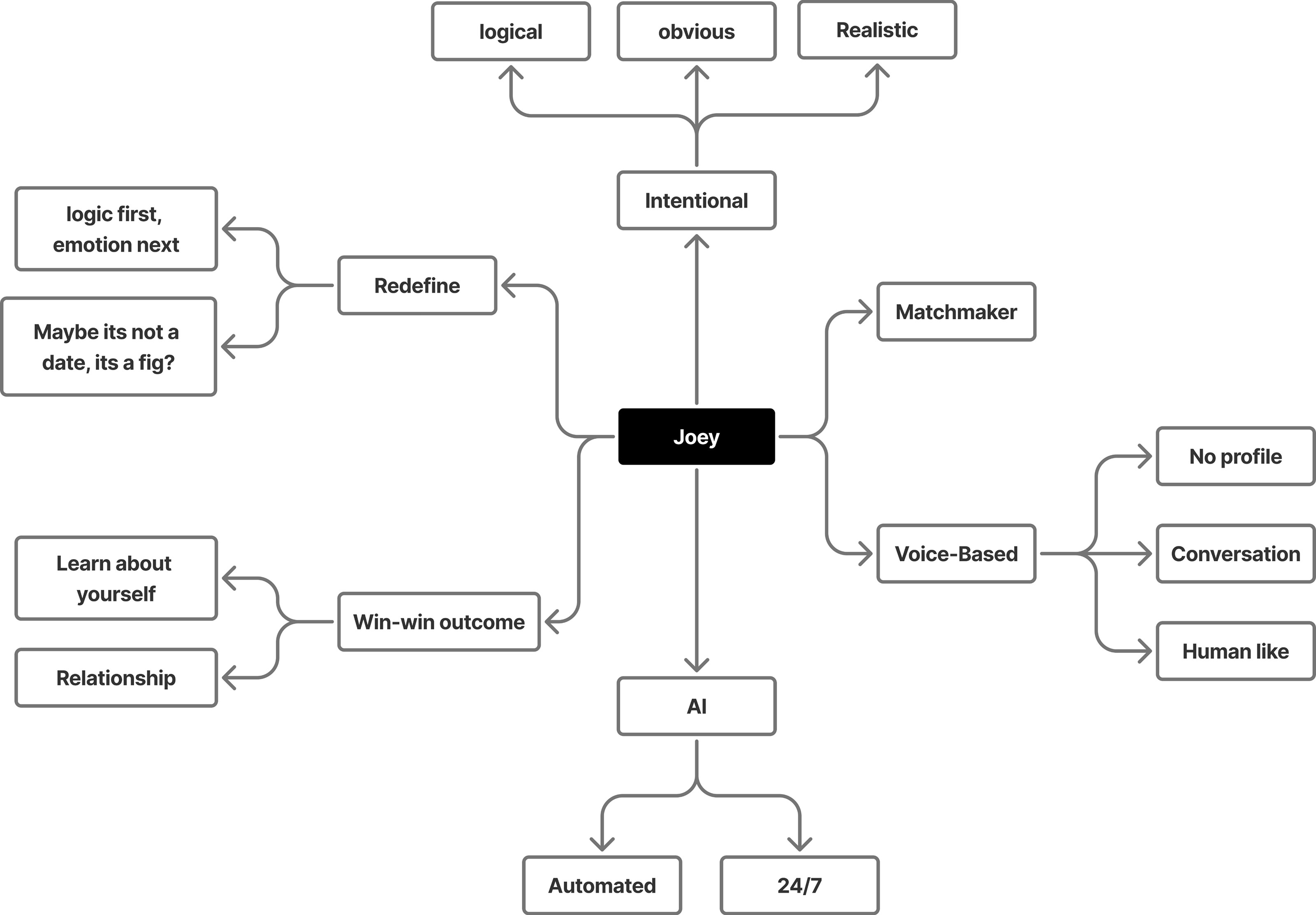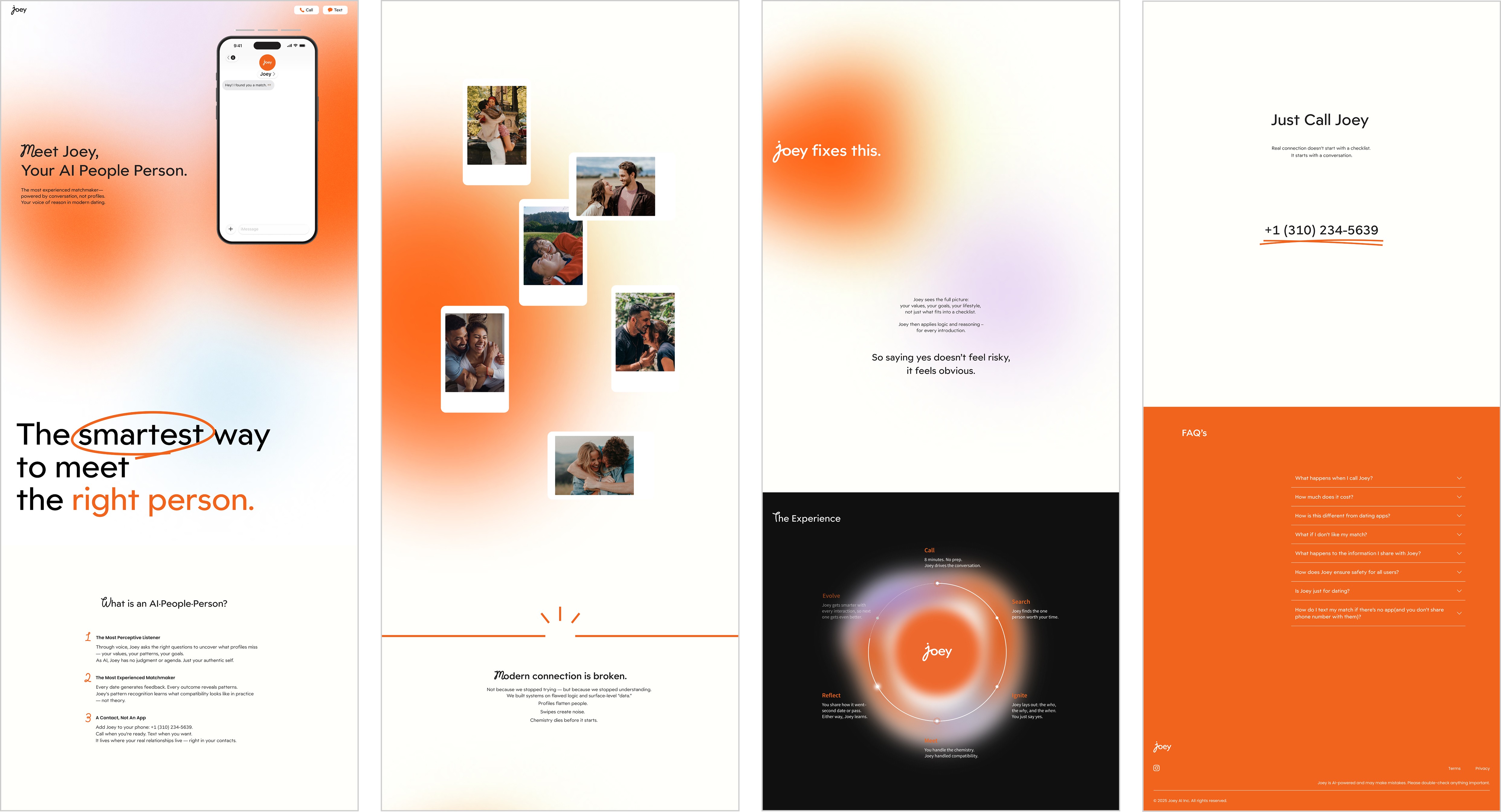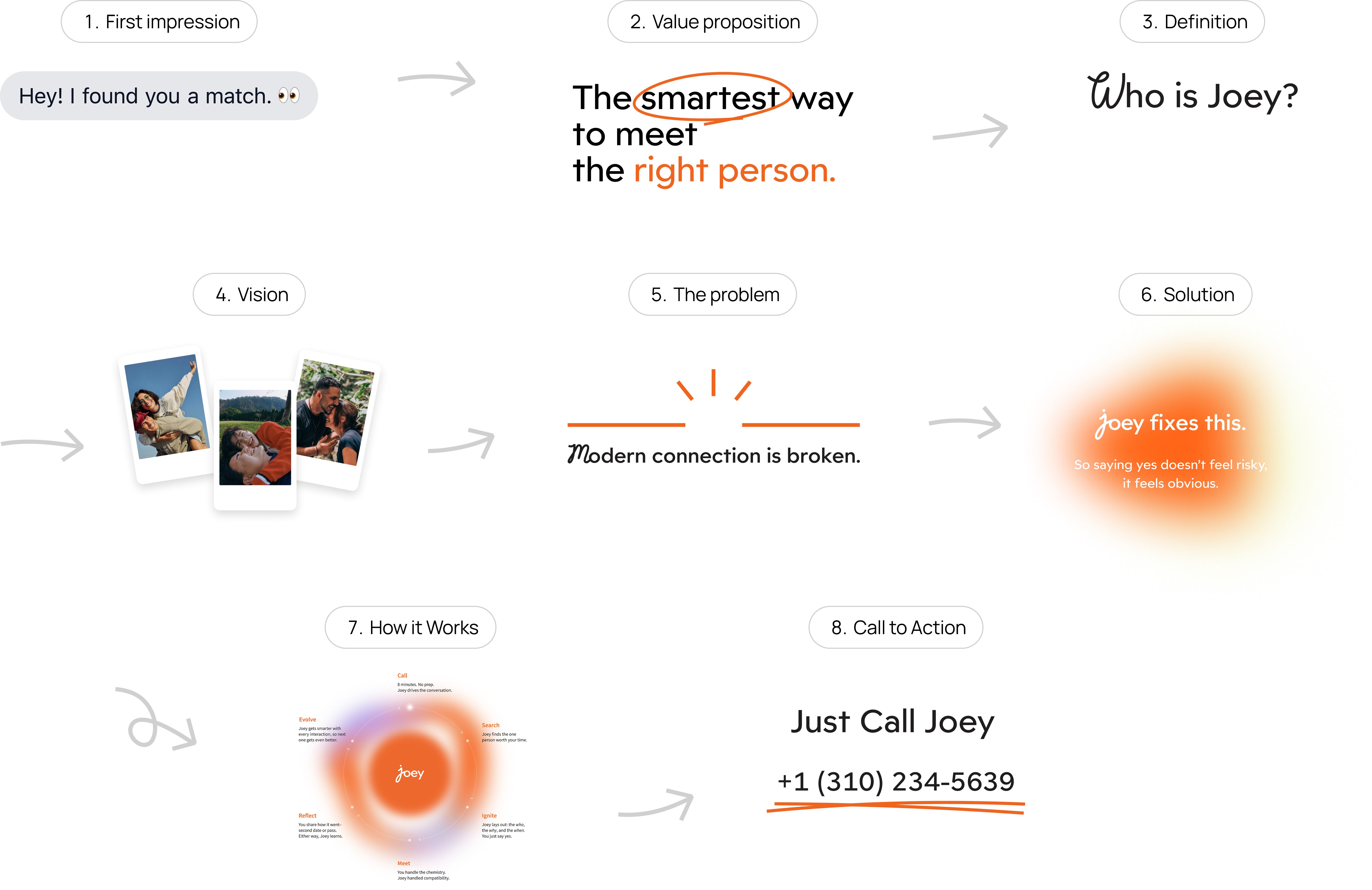 Process of Joey is broken into six human-centered stages: calling, searching, igniting, meeting, reflecting, and evolving. This helps users understand what it feels like to engage with Joey over time.