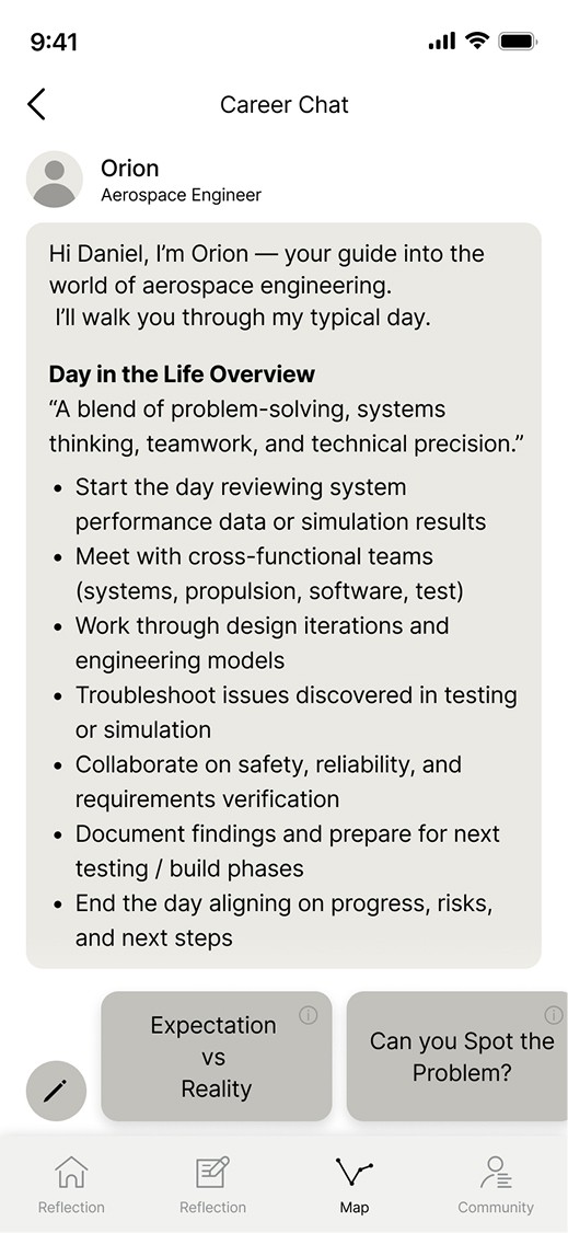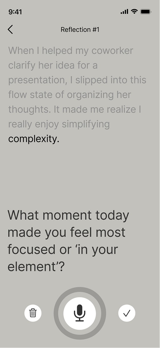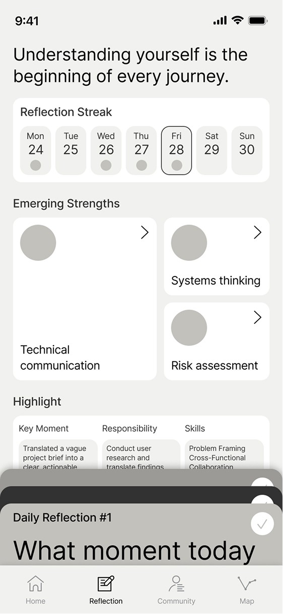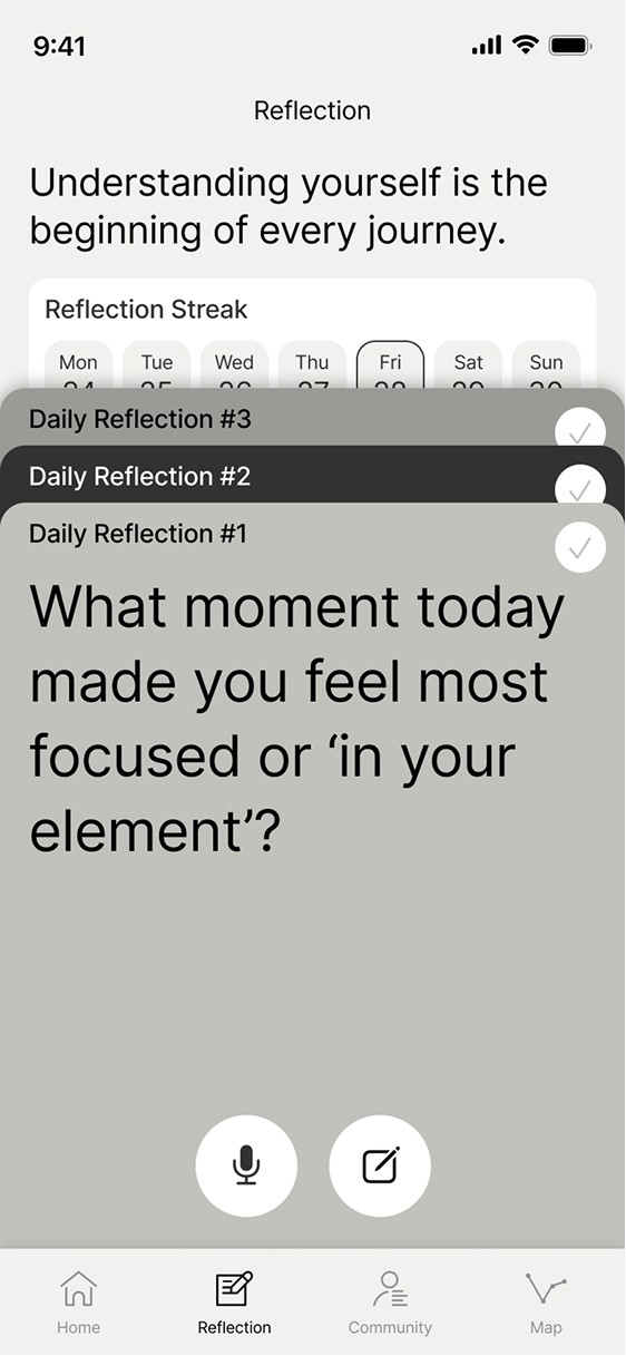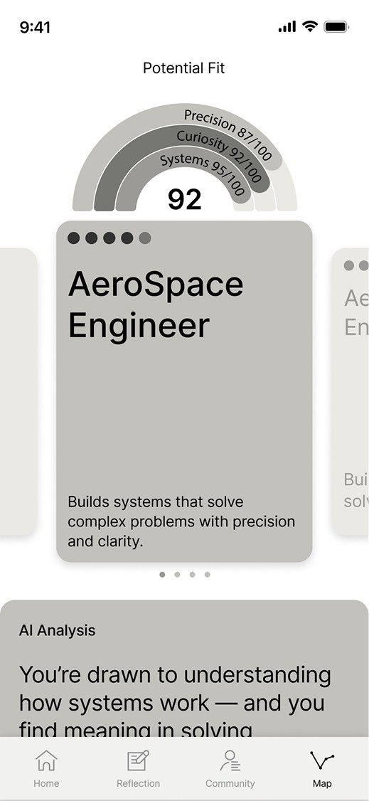 The reflection space is designed to understand users through reflections on everyday moments, revealing patterns that connect to potential career paths.