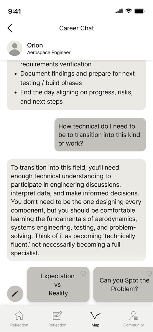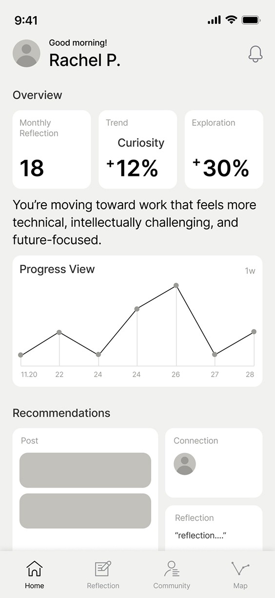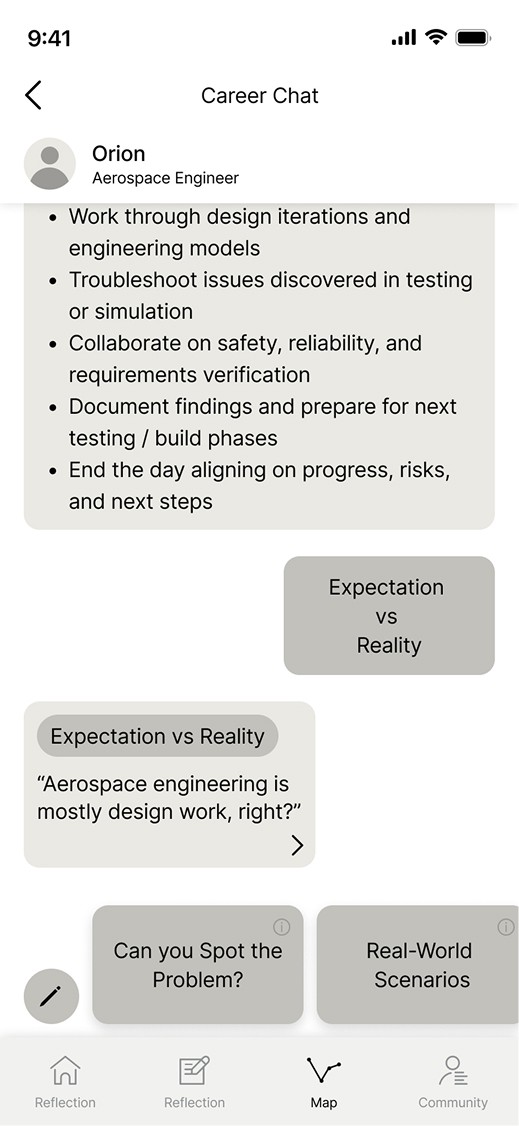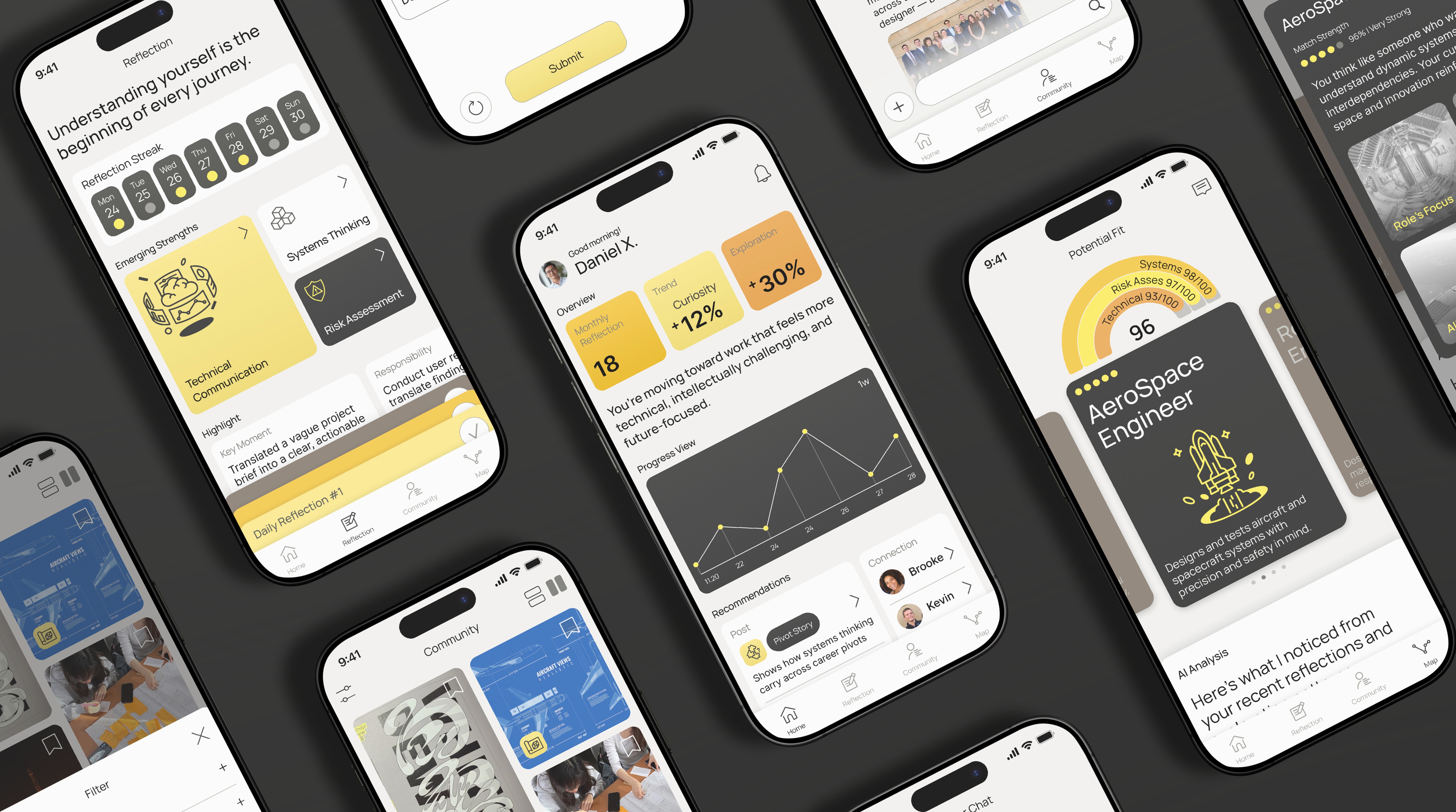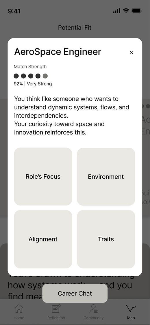 The reflection space is designed to understand users through reflections on everyday moments, revealing patterns that connect to potential career paths.
