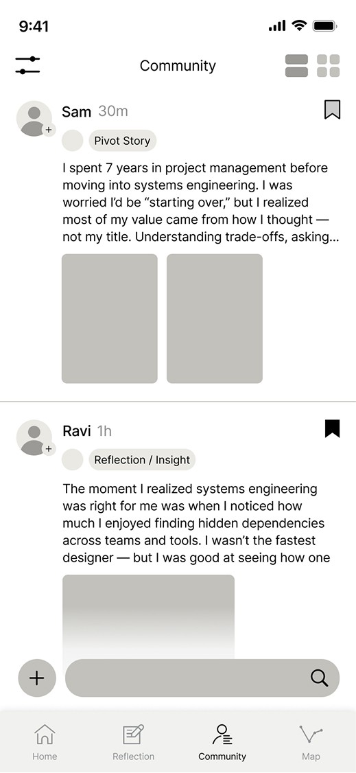 Map tab turns reflections and explorations into a navigable view of potential paths, revealing directions and connections rather than a single destination.