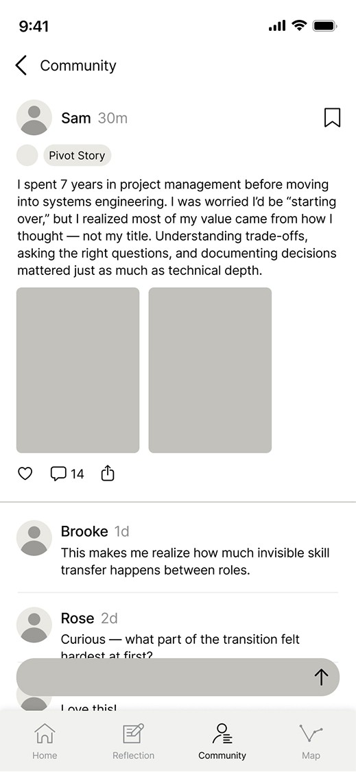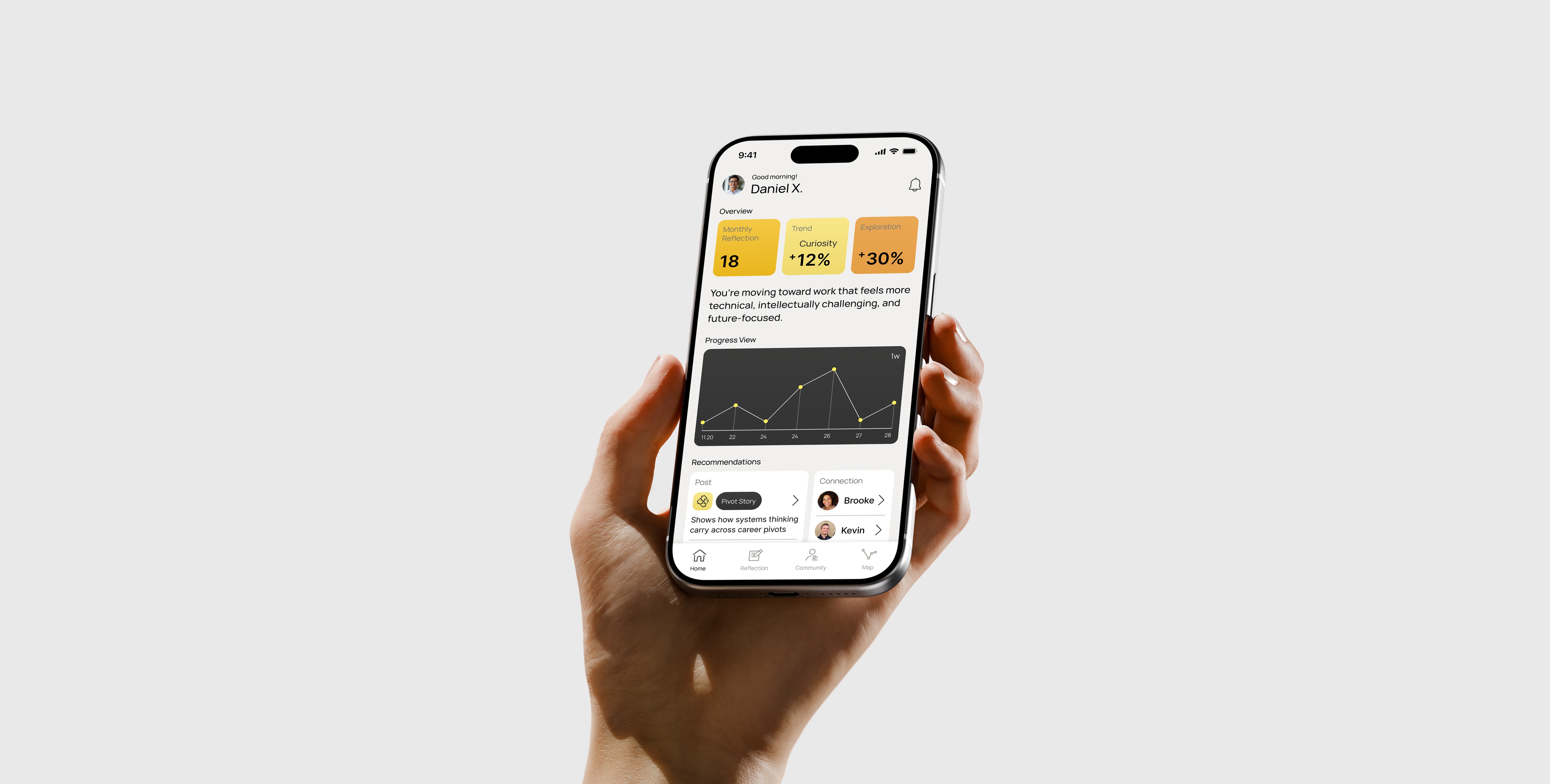 If I were to continue, I'd focus on the transition from self-knowledge to action — the moment a user has clarity and needs to know what to do with it. I'd also want to test whether the reflection prompts actually surface the patterns they're designed to, and whether users trust the insights enough to act on them.