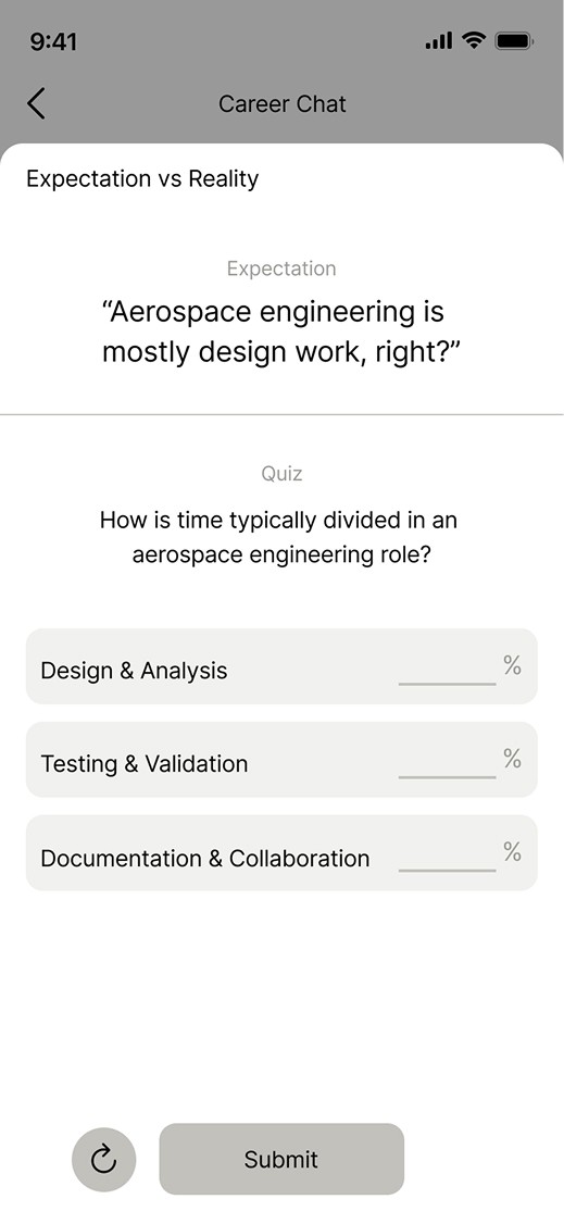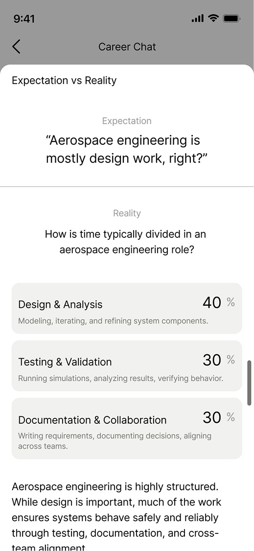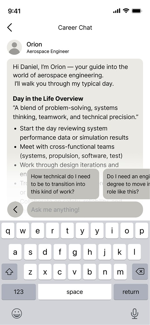 I designed Career Chat to help users explore careers through AI role personas, using curated questions and quizzes to deepen their understanding.