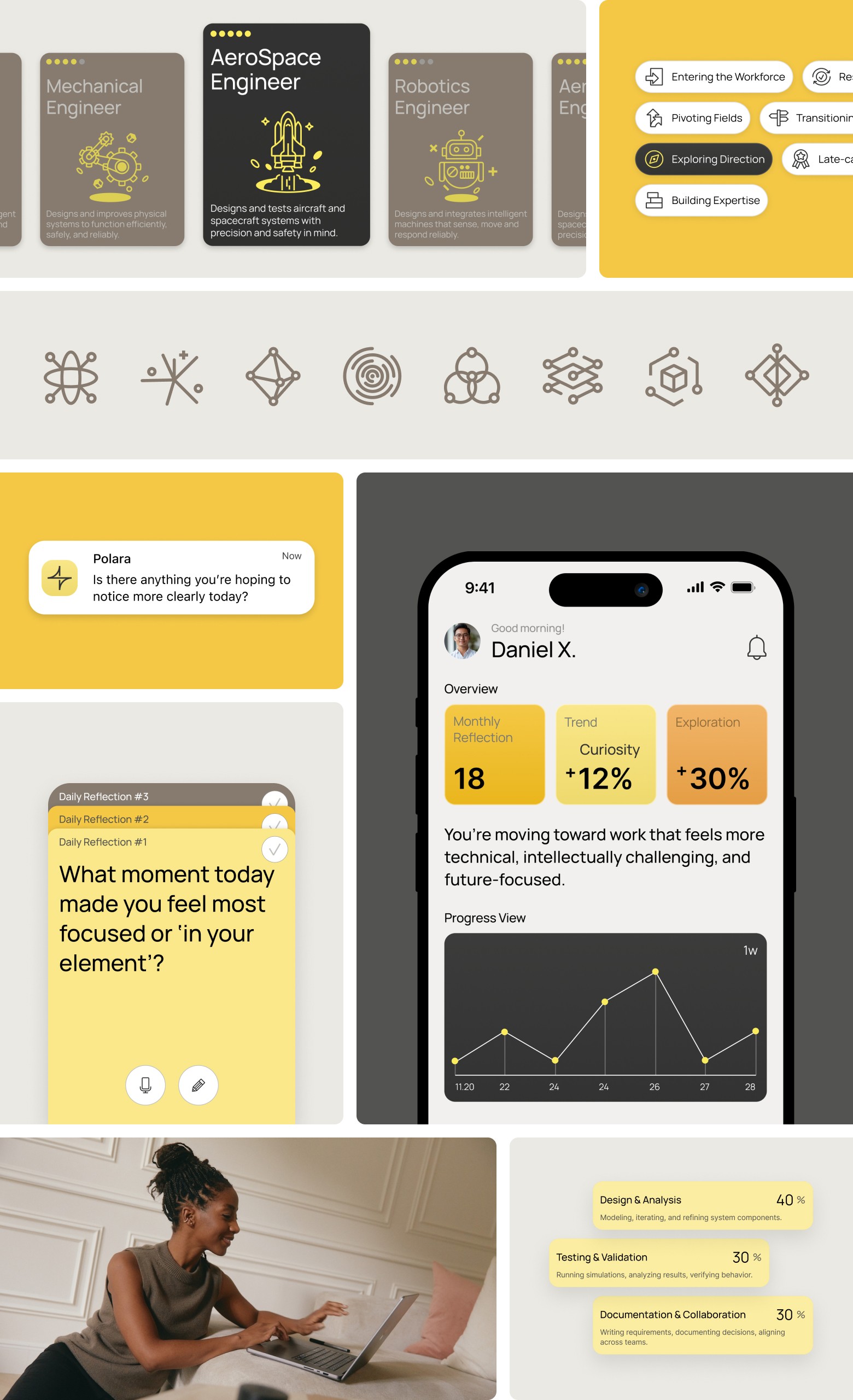 Polara's palette is built on contrast — yellow against dark monotone, the way a single career direction can speak to you clearly once you finally see it. The same precision carries into the icon and illustration system, built on a geometric language with horizontal cut edges that represent career directions and themes like motivation, values, and reflection with clarity and consistency.
