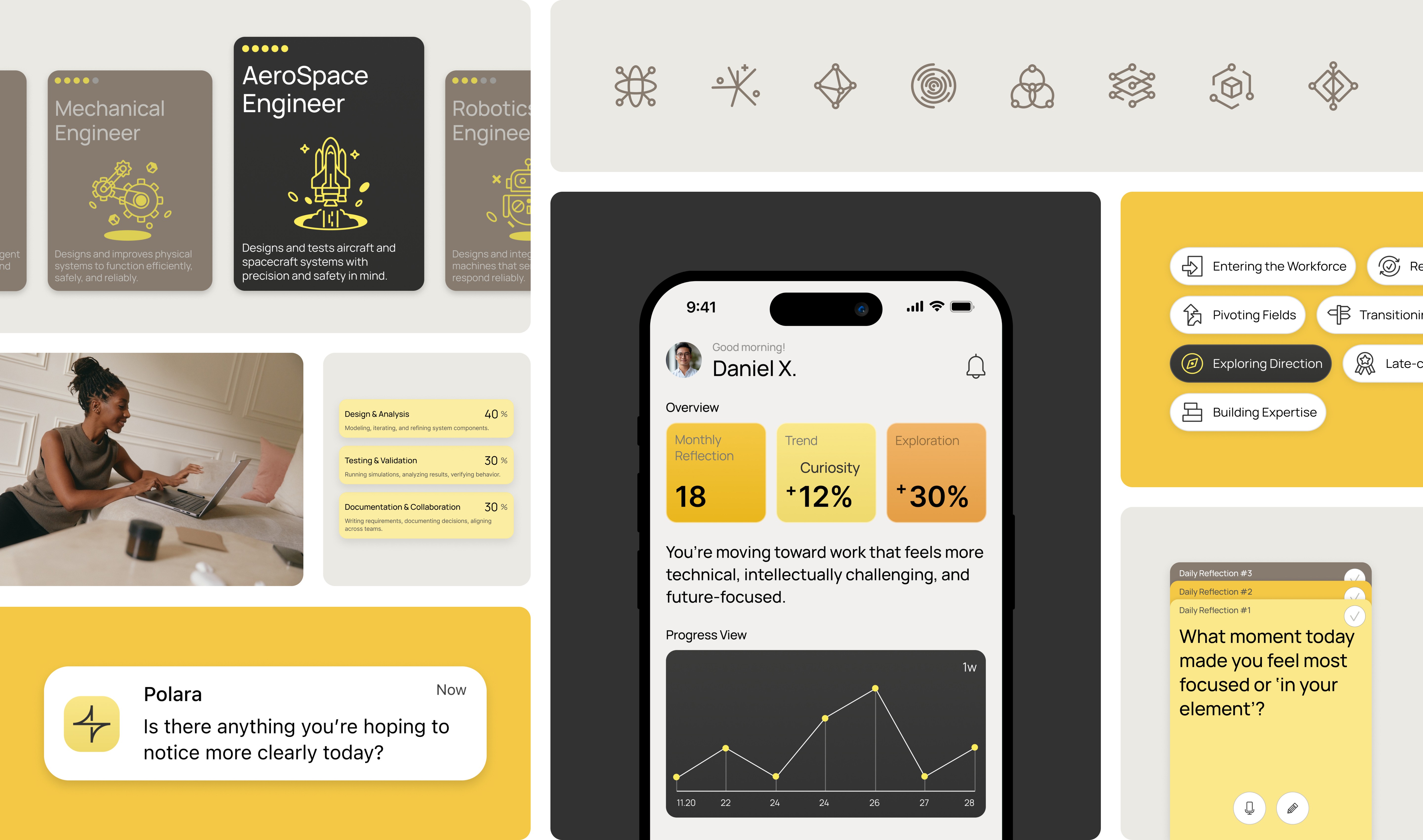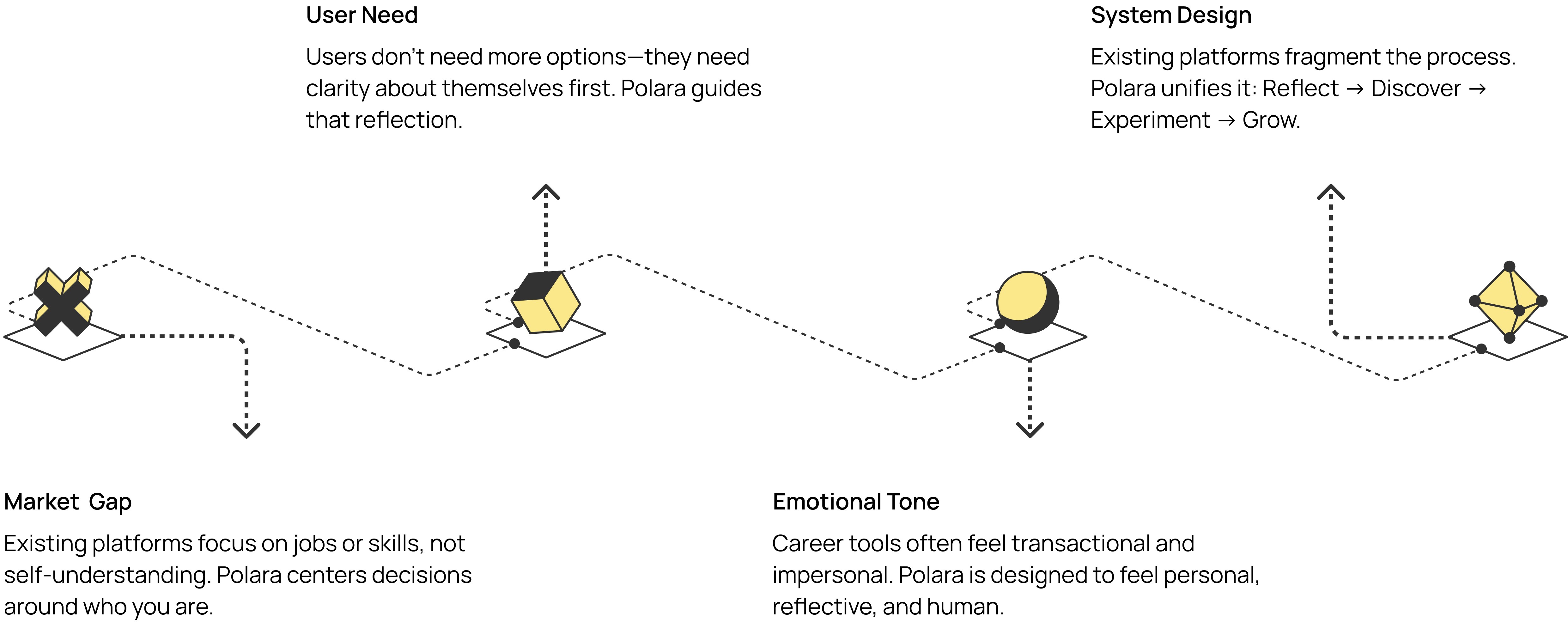 The hardest part wasn't designing the features — it was figuring out what question Polara was actually trying to answer. Early on I kept designing for career discovery, when the real problem was self-discovery. That reframe changed almost every decision that followed.