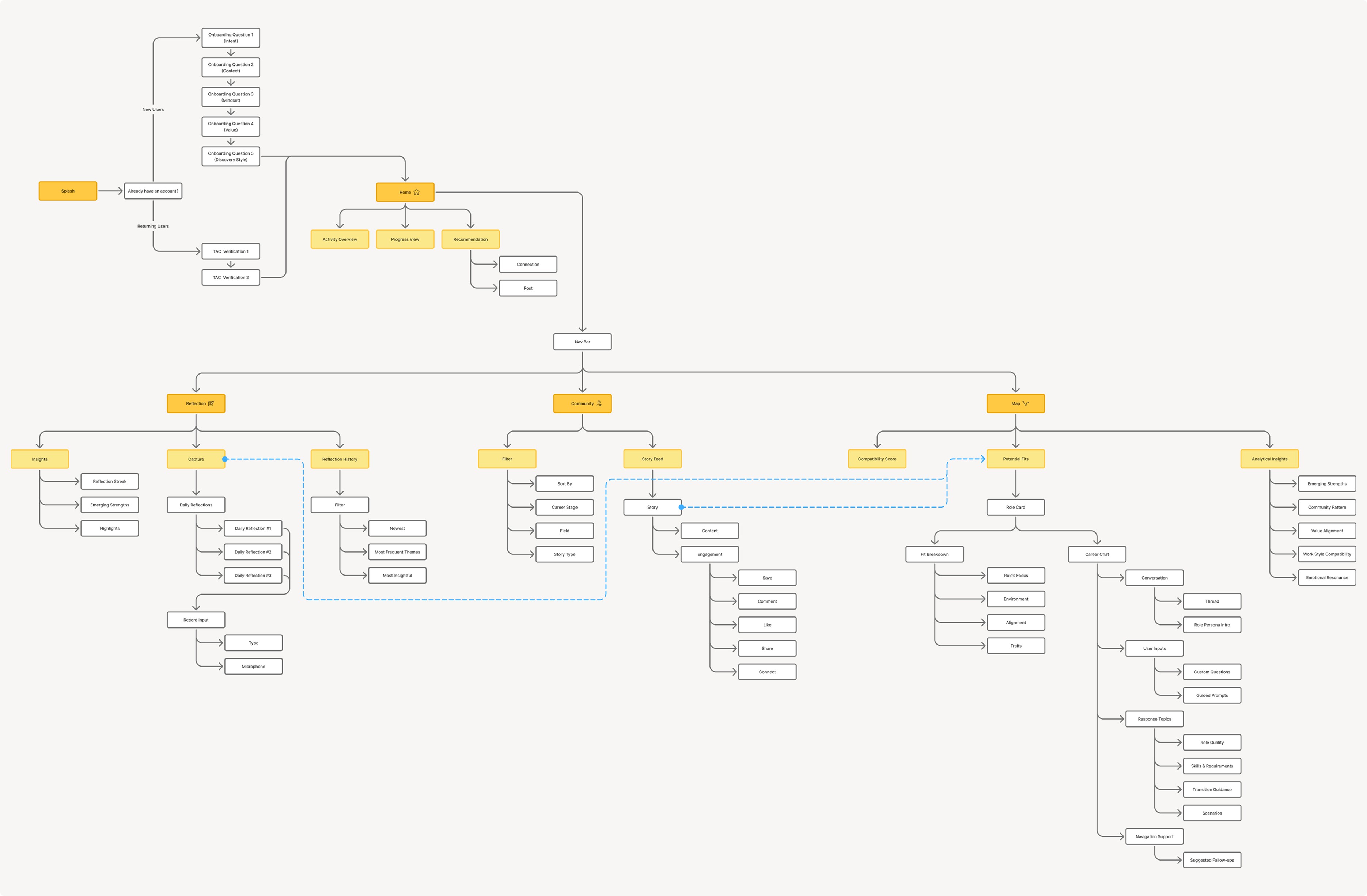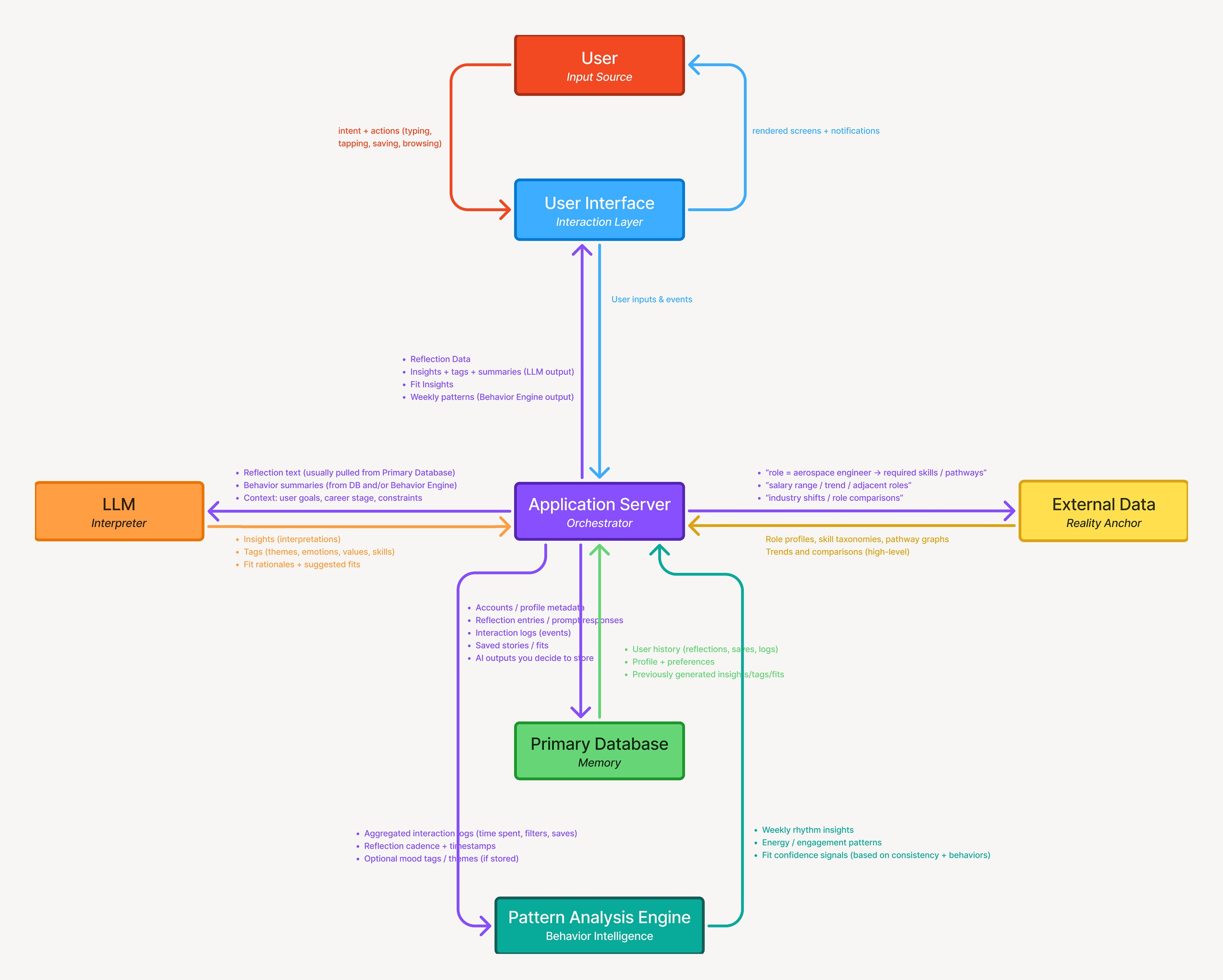 I mapped the full user journey and system architecture to ensure every feature connected back to a single goal: helping users build self-understanding over time.